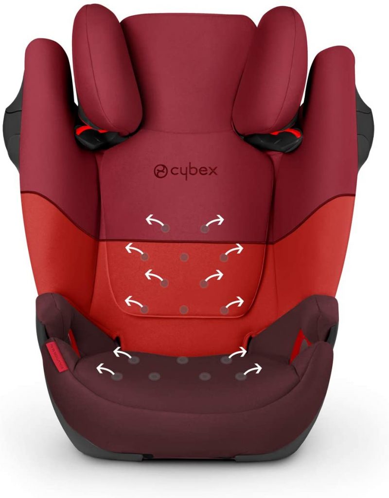 Para garantizar la máxima comodidad, Solution M-Fix cuenta con un asiento amplio y profundo, un reposacabezas con 12 alturas y un sistema de ventilación. Esta silla se fija al asiento del coche con el cinturón de seguridad del propio vehículo.